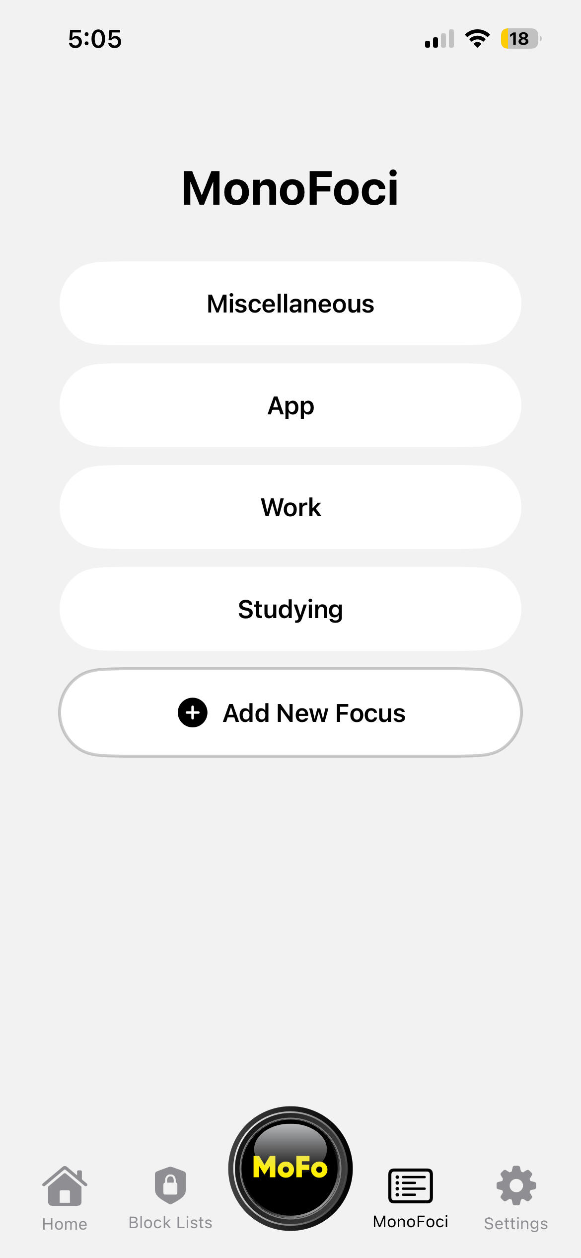 MonoFoci are created by the user. Weekly goals for each can be set, and total time spent weekly is tracked. "Miscellaneous" is created on app install so that it available to use right away.