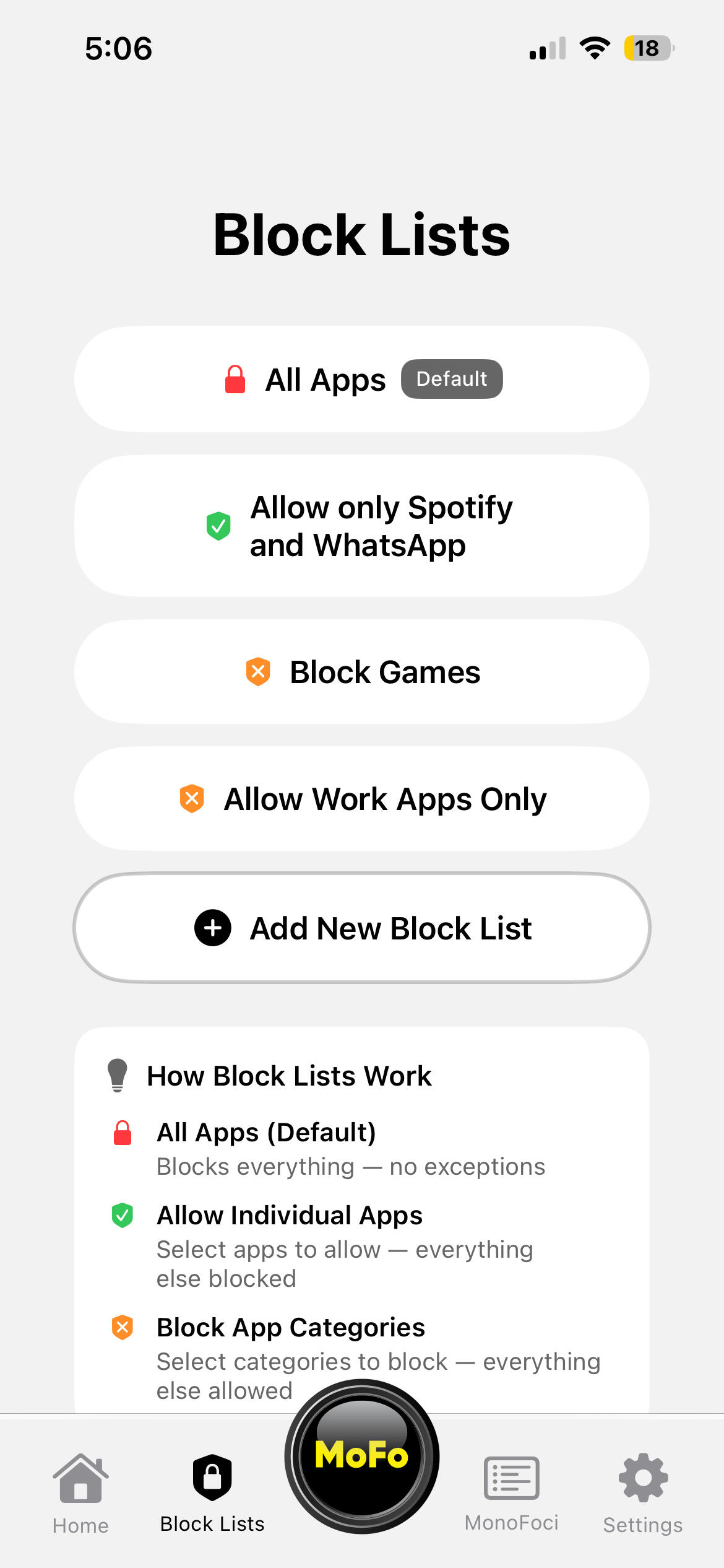 Block Lists can be created that are specific to the users needs. For example, a blocklist can be used in a focus session to only block Social Media, allowing them to still access Mail, Slack, etc. A Block List "All Apps" is available to all users on app install, allowing them to simply block all apps.