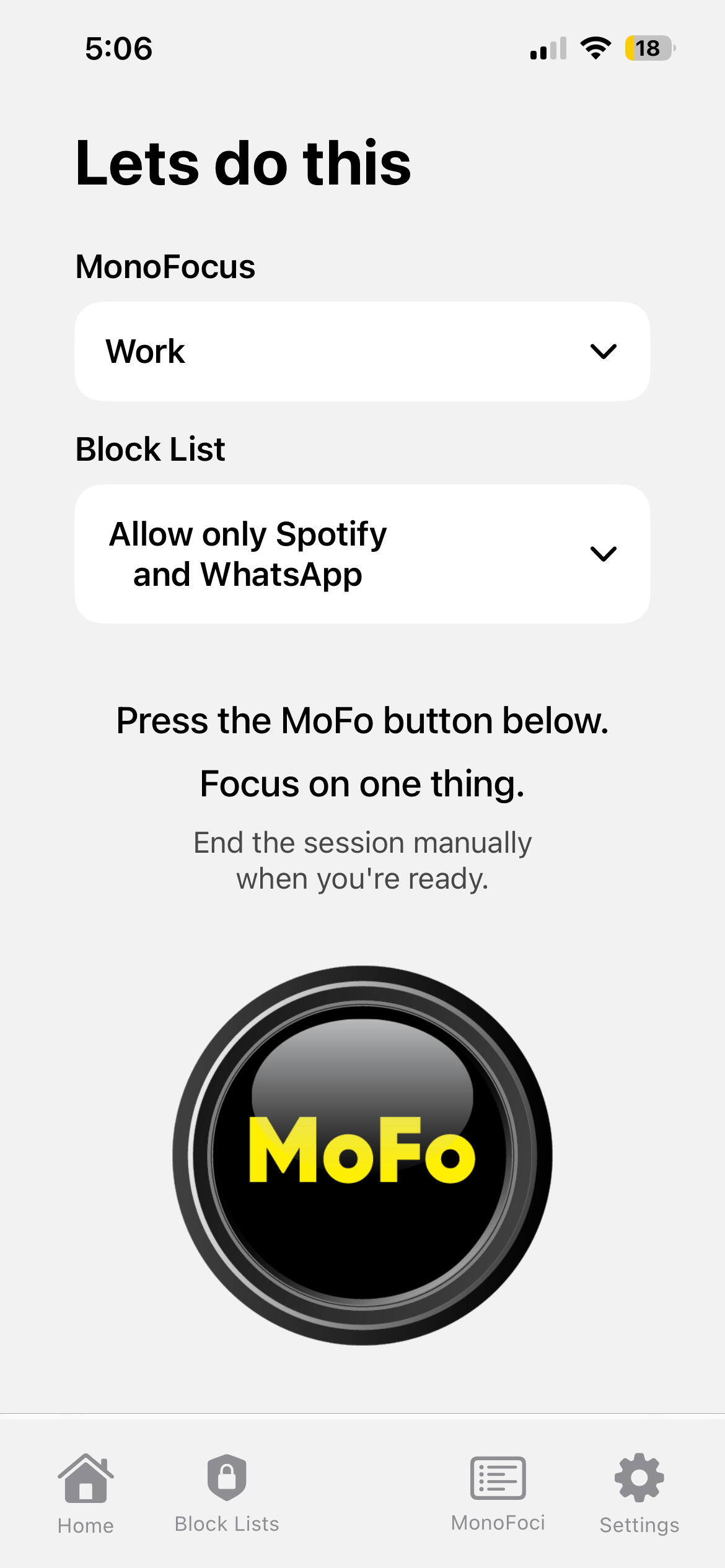A focus session is commenced simply by selecting what Monofocus to track, and what Block List to use. Press the MoFo button to start.